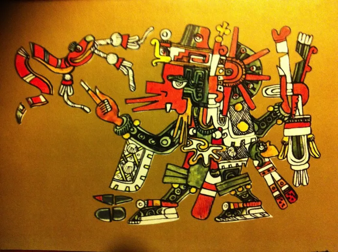 Huitzilopochtli fue el dios de la guerra de los aztecas, su patrono e inspiración en la conquista de casi toda Mesoamérica durante el periodo Posclásico. Huitzilopochtli significa ?colibrí zurdo? o ?colibrí del sur?. También se le nombraba como Ilhuícatl Xoxouhqui, es decir, ?cielo azul? y Tlacahuepan cuexcotzin. Para los aztecas era el dios de los combates y del Estado, su patrono e inspiración en la conquista de casi toda Mesoamérica durante el periodo Posclásico.